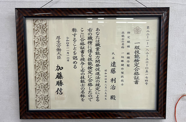 当店には、国家資格である「一級眼鏡作製技能士」の資格を持つ専門スタッフが在籍しております。
